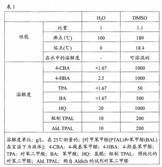 在此作為溶劑使用的二甲基亞砜和水的物理性能,以及對苯二甲醛和主要雜質在它們中的溶解度如下表1所示。